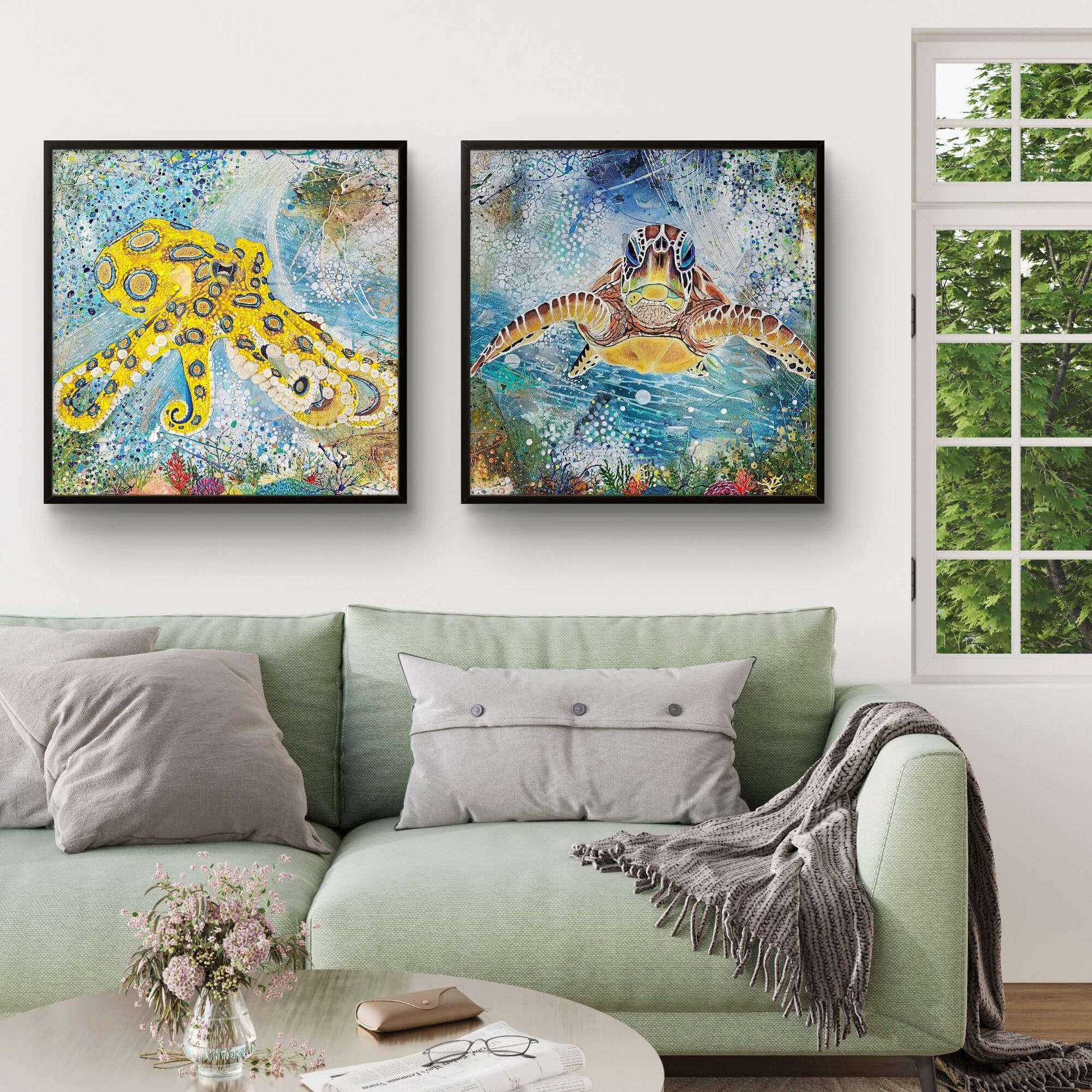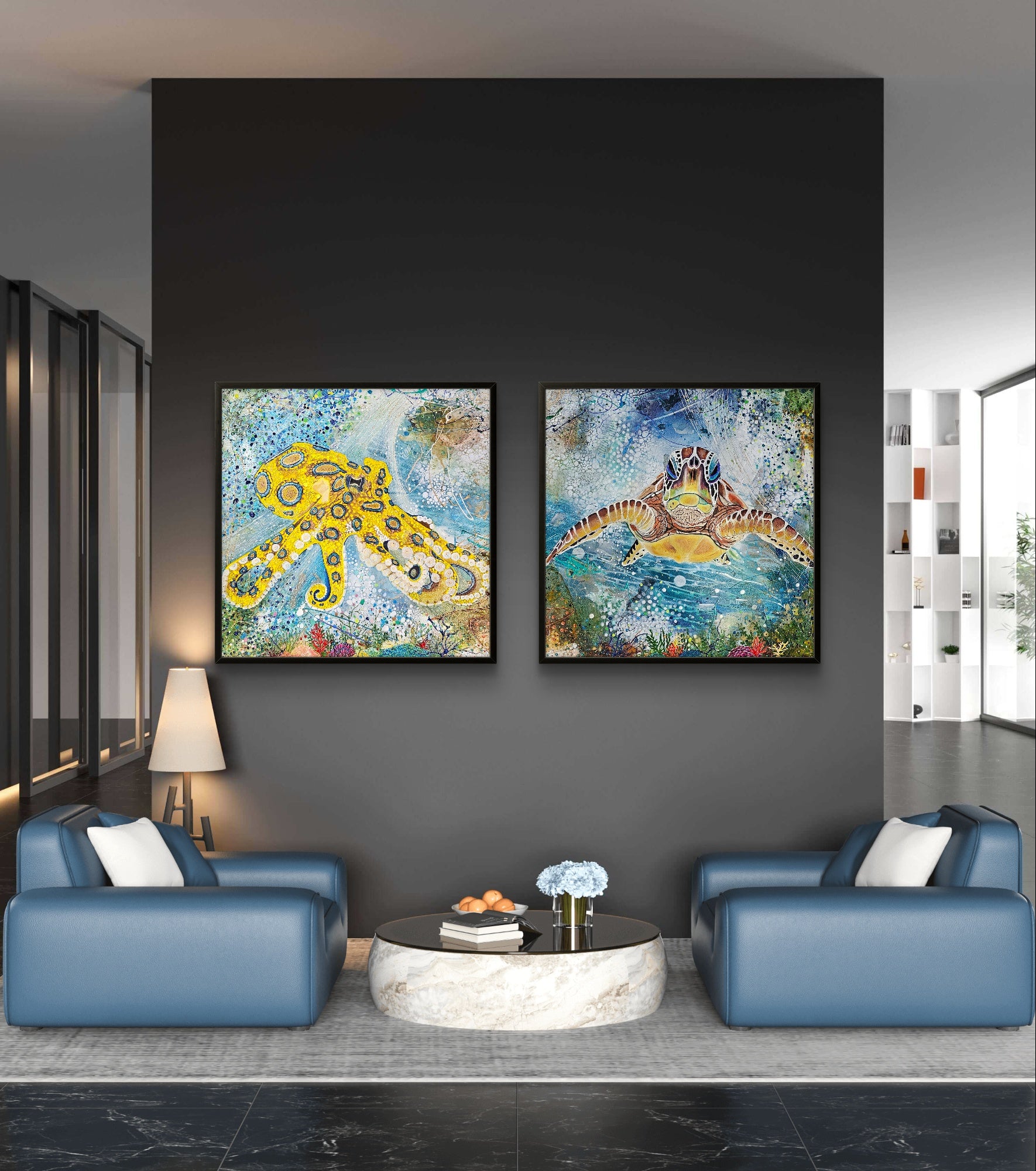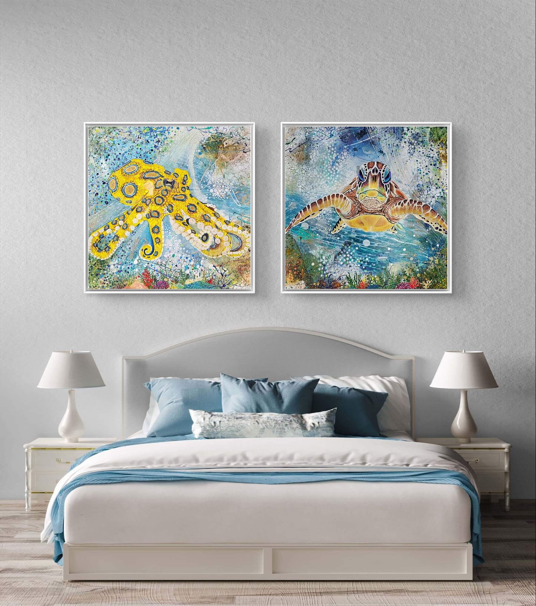 Aussie Seas (pair) - 'Blue Ringed' Octopus - The brilliance and danger of the small Blue-Ringed Octopus features its irridecent blue lines with layers of texture and colour. This small but elusive marine creature is brought to life, set against a vibrant underwater world of the reef.