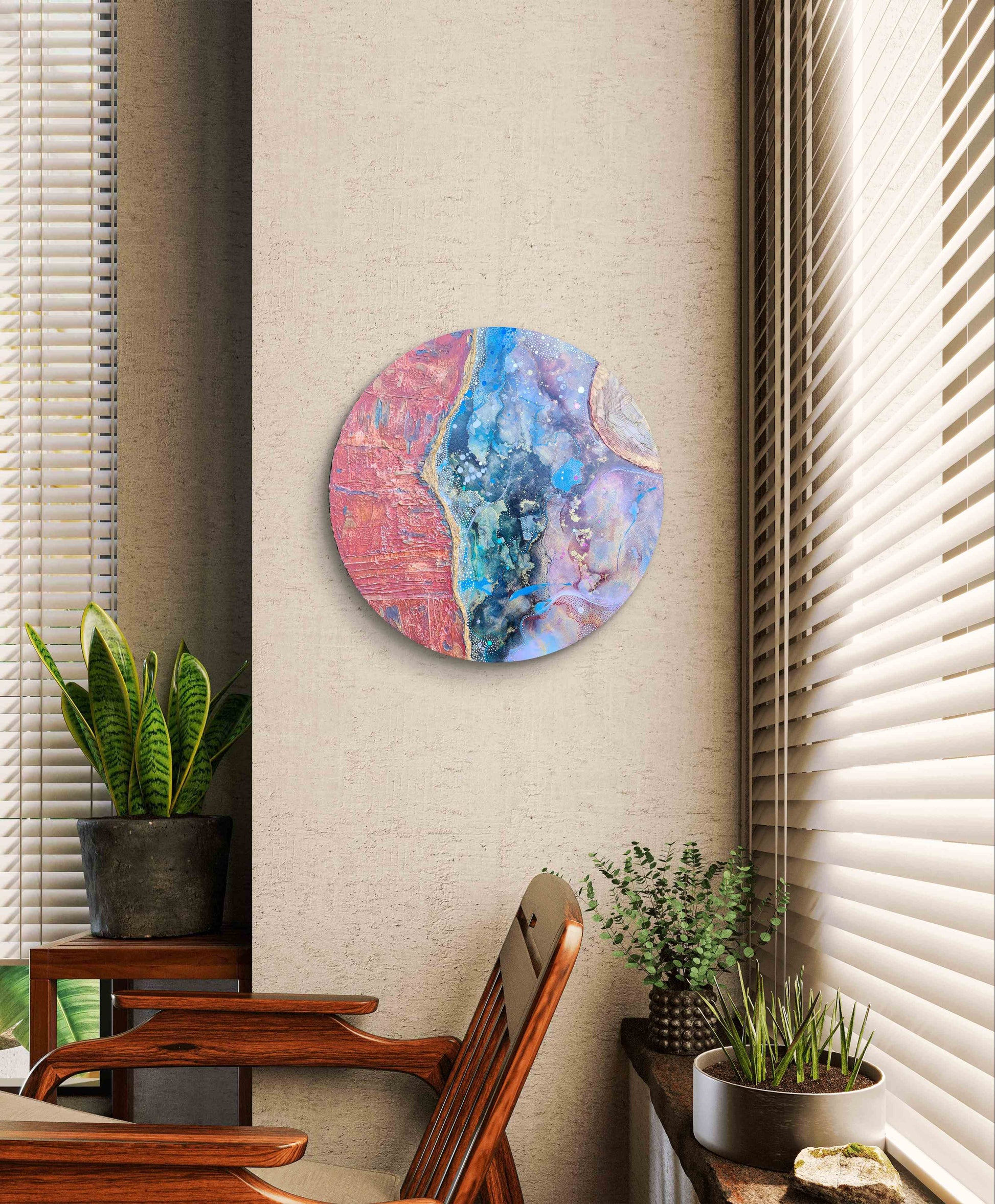 Union Garden Series - “Footsteps in the Garden” is a round, abstract piece that beautifully blends vibrant textures and colors to create a 3D effect. The artwork combines acrylics and ink, resulting in layered depth and a sense of movement across the surface. Textured earth transitioning into water & the sky. Footsteps through the contrasting environment.
